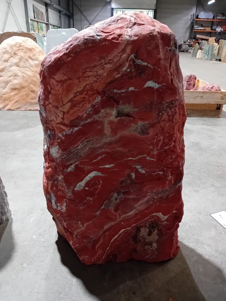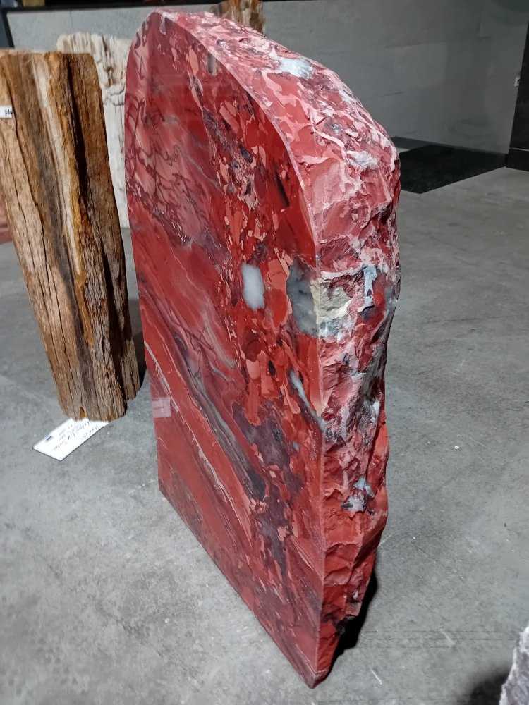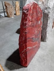 Deze gedenksteen van rode Jaspis met een gepolijste voorkant en bekapte zijden word gevonden in Brazili en heeft een mooie rood met zwarte Kleur met daarin metaal achtige aders.